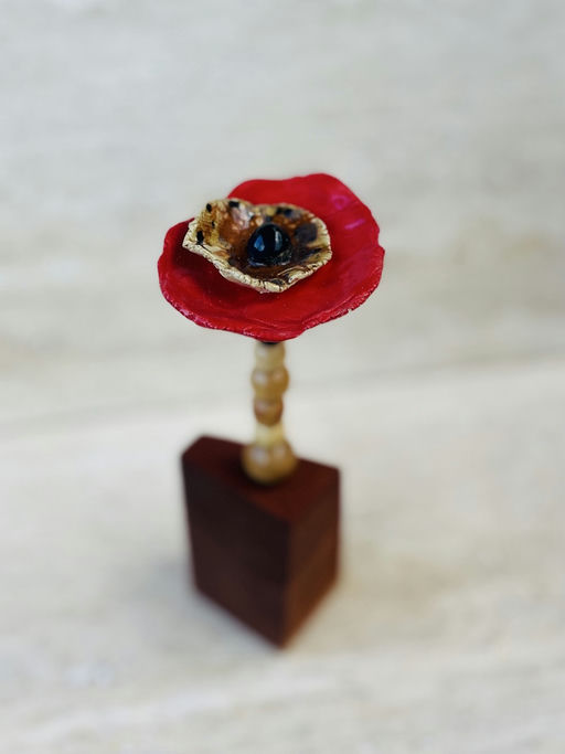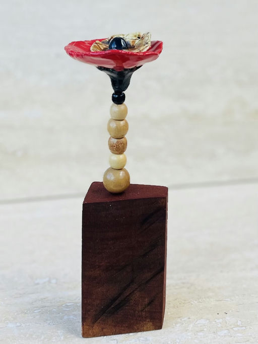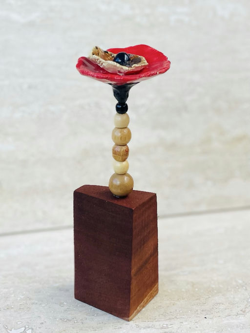 Reclaimed tropical wood, beads and ceramic poppy